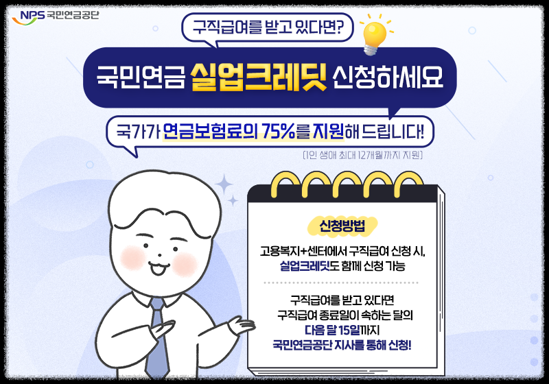 ※ 구직급여를 이미 받고 있다면 구직급여 종료일이 속하는 달의 다음 달 15일까지 국민연금공단 지사를 통해 신청합니다.