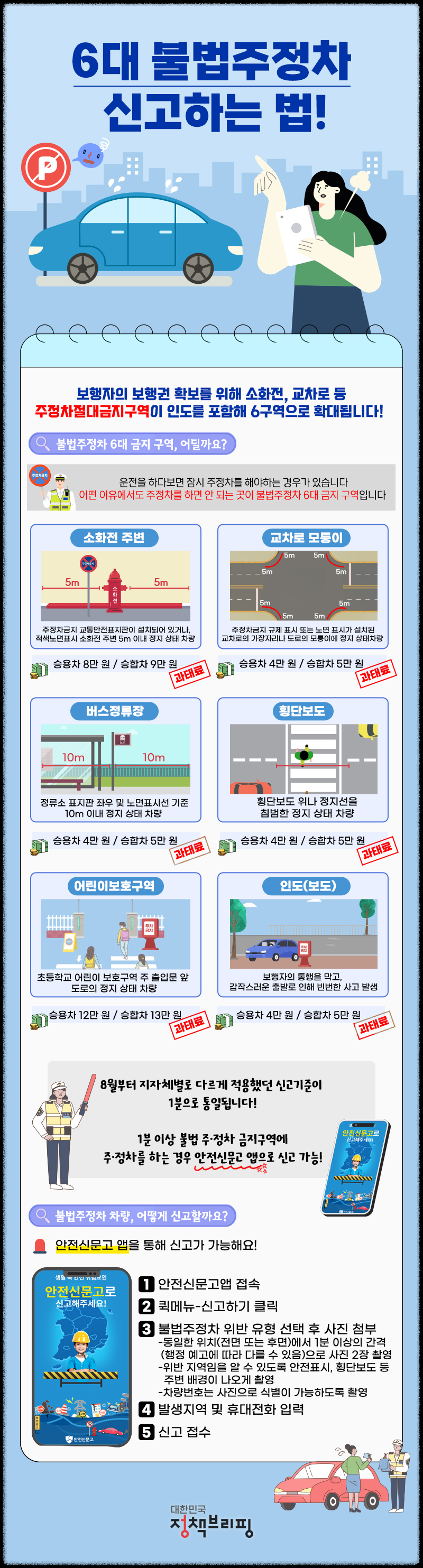 8월부터 인도를 포함해 6대 주정차 금지 구역에 1분만 차를 세워도 다른 주민이 신고하면 과태료가 부과됩니다.