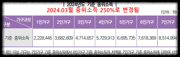 가구소득은 가구원 수에 따른 기준중위소득이 2024년 03월 180%에서 250% 이하로 변경되어 혜택의 범위를 확대하였습니다. 직전 과세 기간의 소득이 확정되지 않은 경우에는 전전 연도 소득으로 확인합니다.