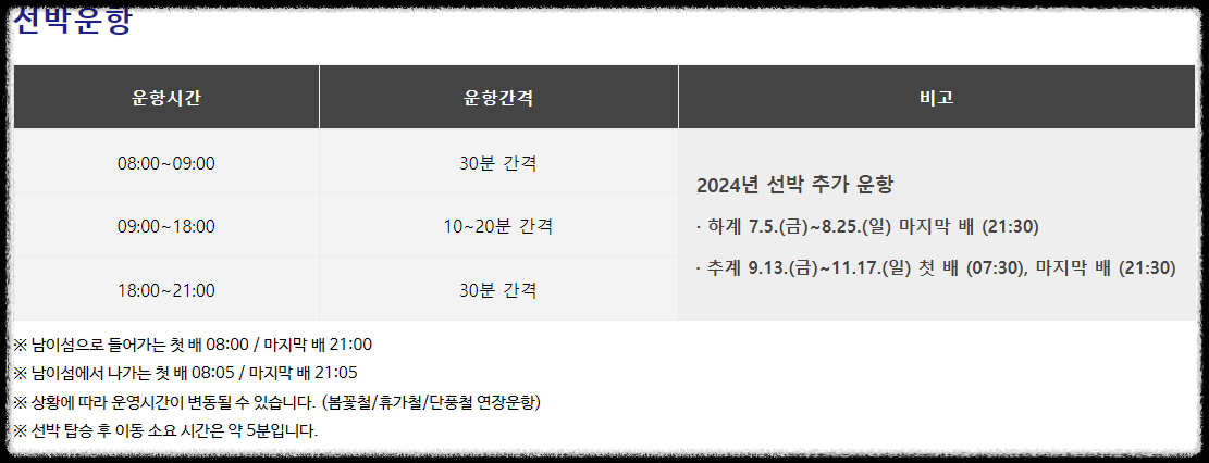 5) 남이섬 선박운행 안내정보: 소요시간은 5分